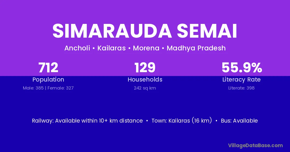 Kailaras (16 km) is the nearest town to Simarauda Semai village for major economic activities and is located approximately 16 km away.