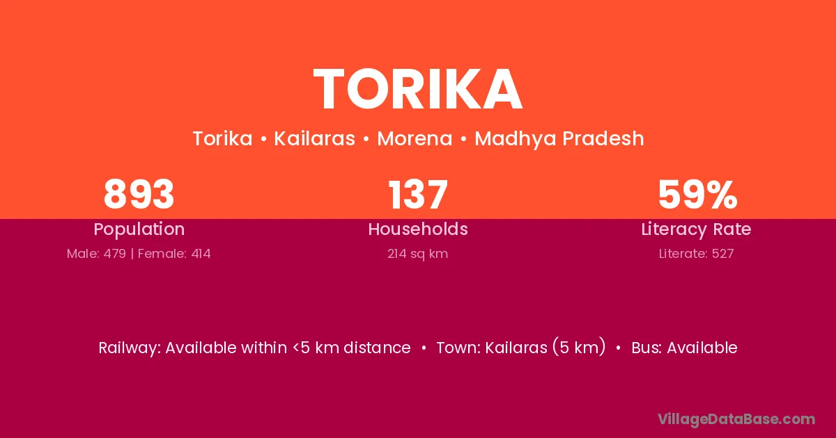 Torika village has a total population of 893 people, of which 479 are males and 414 are females.