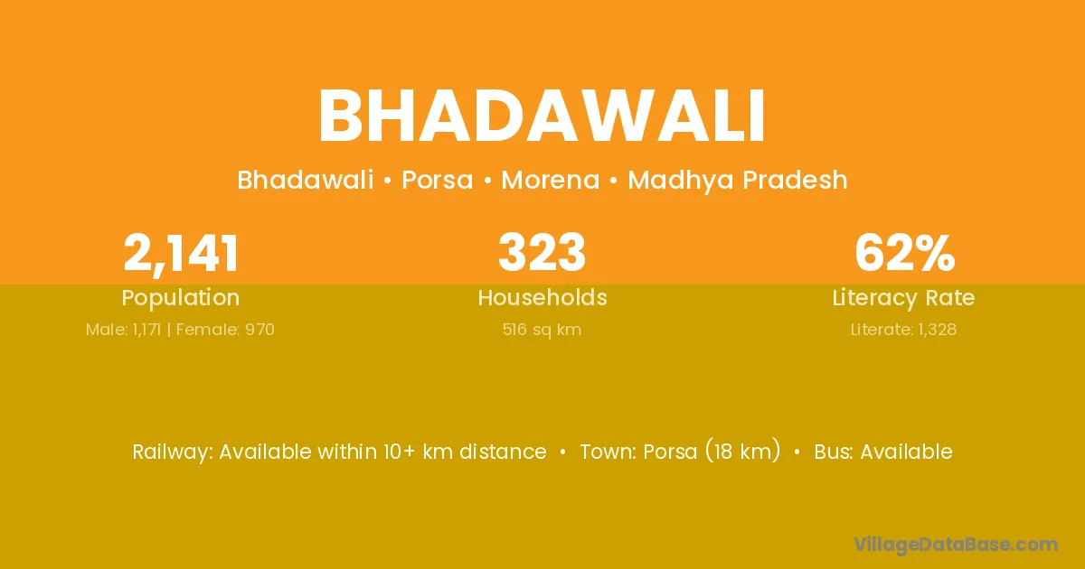Porsa (18 km) is the nearest town to Bhadawali village for major economic activities and is located approximately 18 km away.