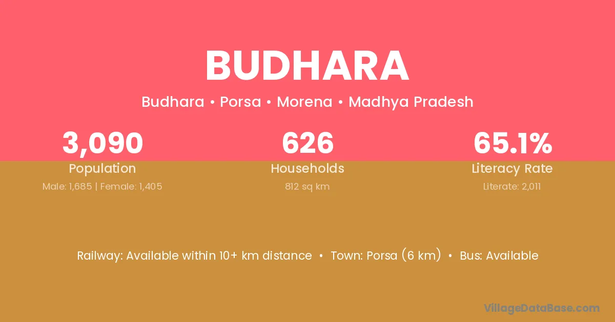 Porsa (6 km) is the nearest town to Budhara village for major economic activities and is located approximately 6 km away.