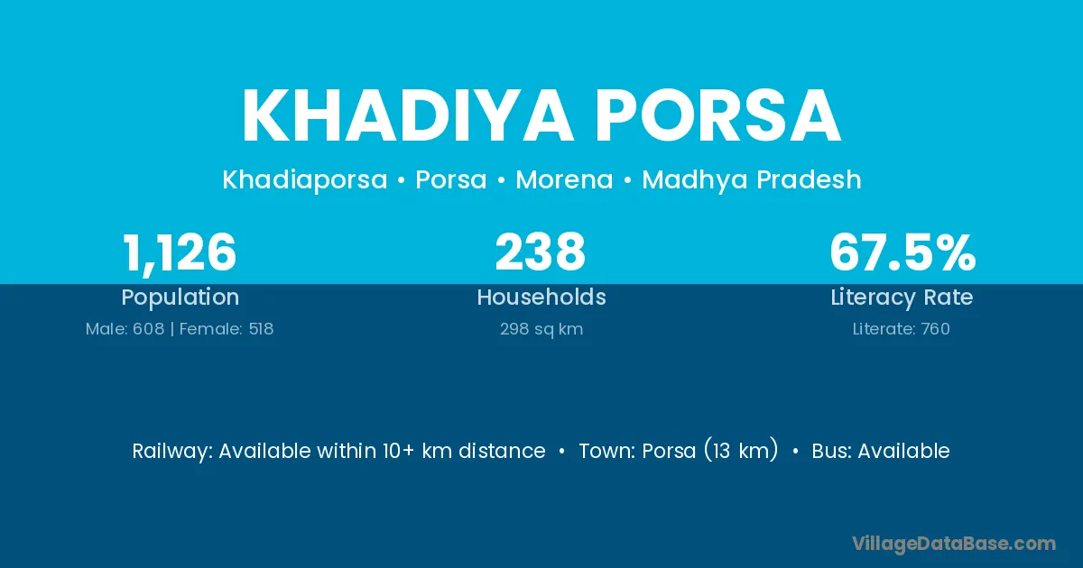 Porsa (13 km) is the nearest town to Khadiya Porsa village for major economic activities and is located approximately 13 km away.