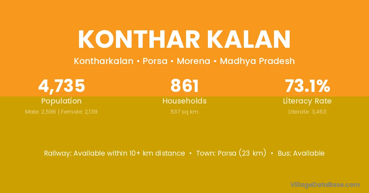 Porsa (23 km) is the nearest town to Konthar Kalan village for major economic activities and is located approximately 23 km away.