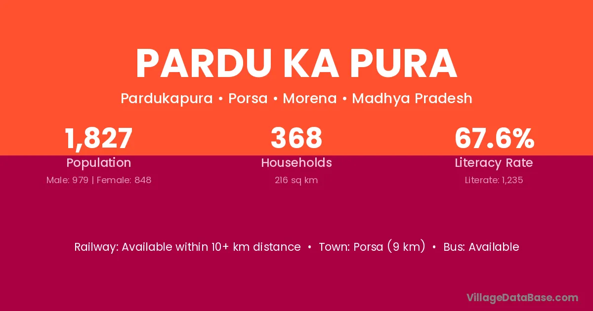 Porsa (9 km) is the nearest town to Pardu Ka Pura village for major economic activities and is located approximately 9 km away.