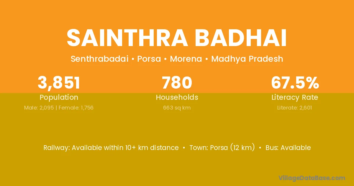 Porsa (12 km) is the nearest town to Sainthra Badhai village for major economic activities and is located approximately 12 km away.