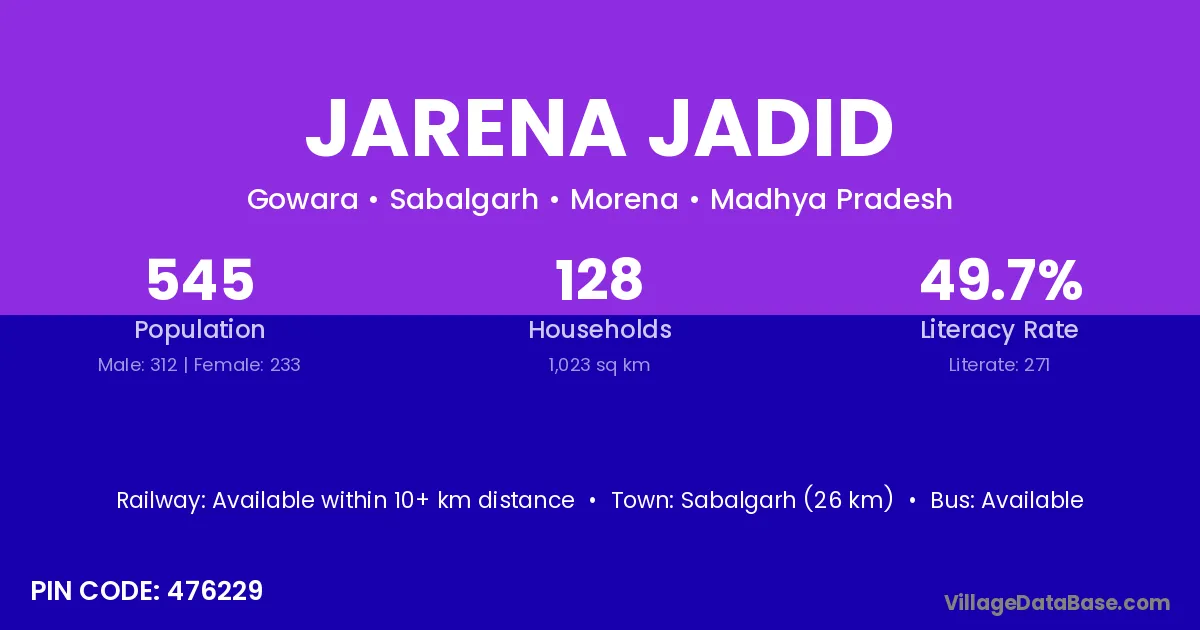 Sabalgarh (26 km) is the nearest town to Jarena Jadid village for major economic activities and is located approximately 26 km away.