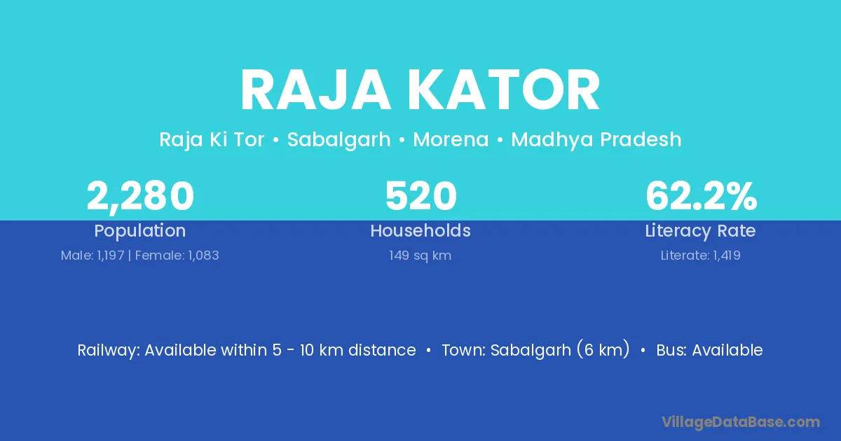 Sabalgarh (6 km) is the nearest town to Raja Kator village for major economic activities and is located approximately 6 km away.