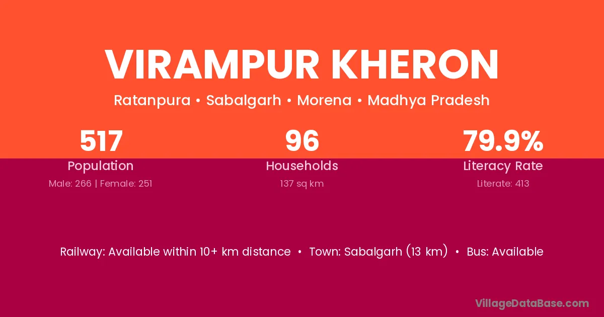 Sabalgarh (13 km) is the nearest town to Virampur Kheron village for major economic activities and is located approximately 13 km away.