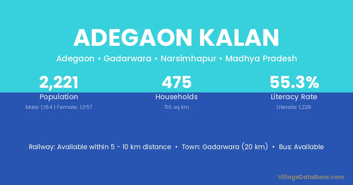 Gadarwara (20 km) is the nearest town to Adegaon Kalan village for major economic activities and is located approximately 20 km away.