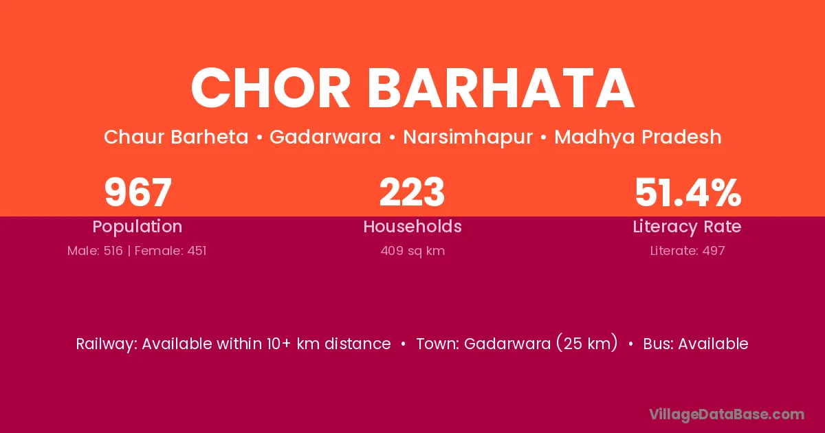 Gadarwara (25 km) is the nearest town to Chor Barhata village for major economic activities and is located approximately 25 km away.