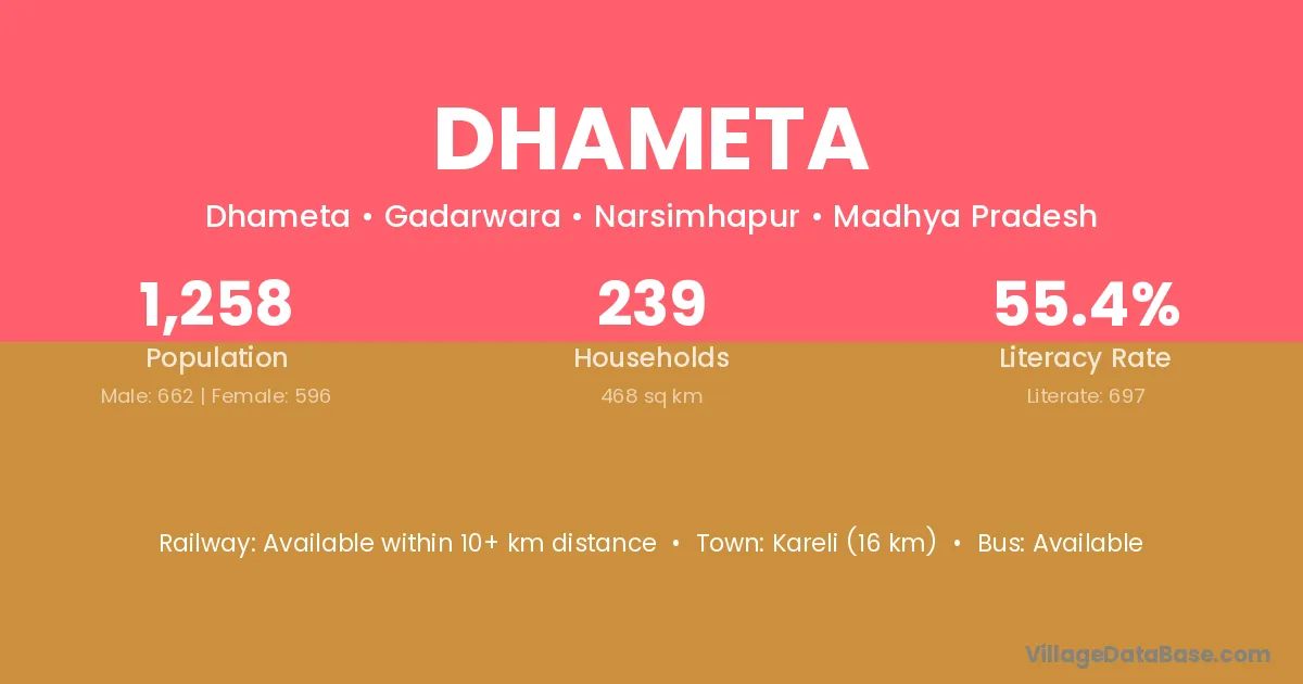 Kareli (16 km) is the nearest town to Dhameta village for major economic activities and is located approximately 16 km away.