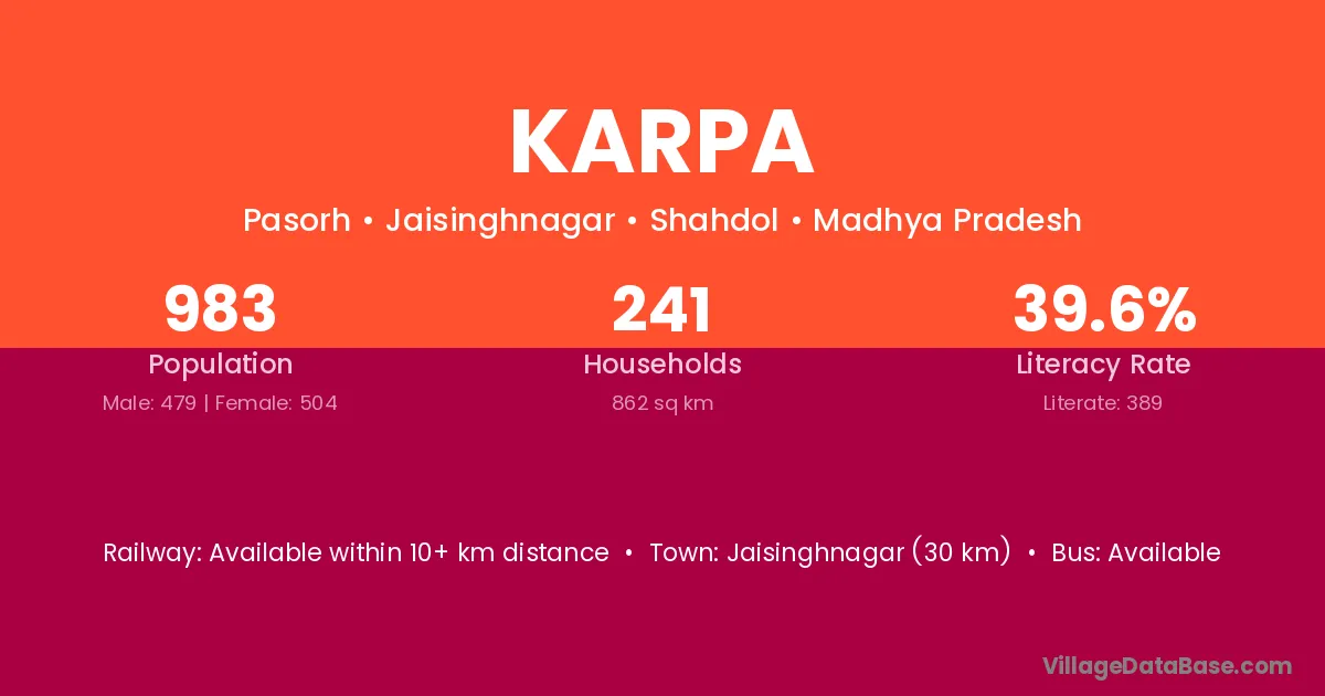 Gadarwara (6 km) is the nearest town to Karpa village for major economic activities and is located approximately 6 km away.