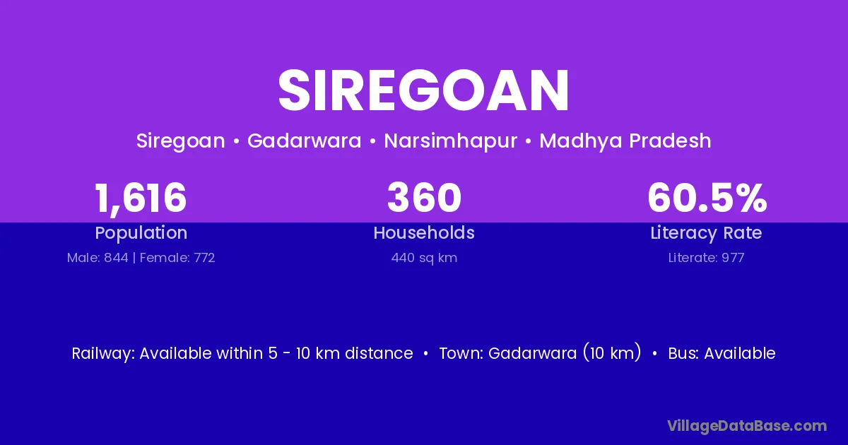 Gadarwara (10 km) is the nearest town to Siregoan village for major economic activities and is located approximately 10 km away.