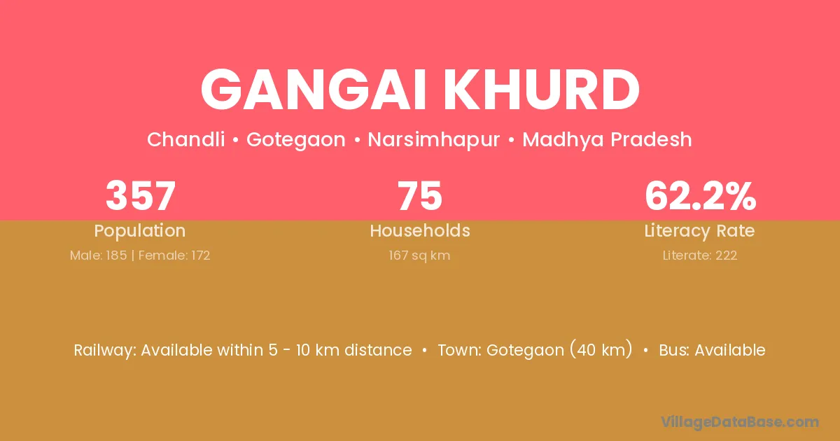 Gangai Khurd village has a total population of 357 people, of which 185 are males and 172 are females.