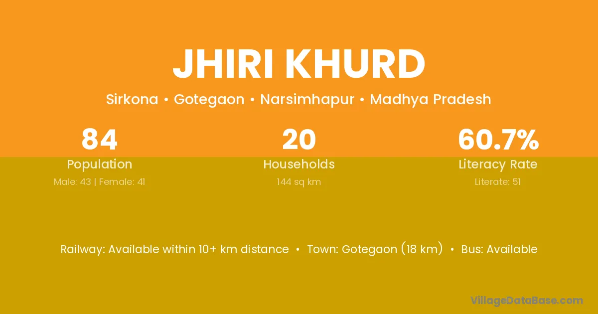 Jhiri Khurd village has a total population of 84 people, of which 43 are males and 41 are females.