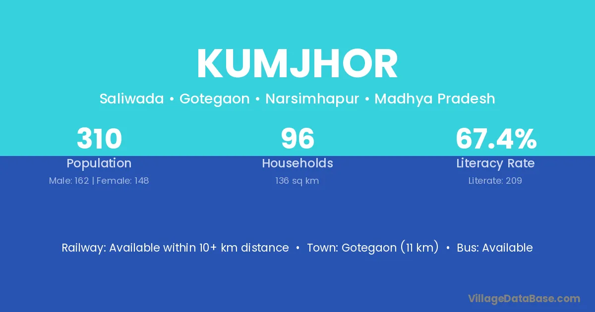 Kumjhor village has a total population of 310 people, of which 162 are males and 148 are females.