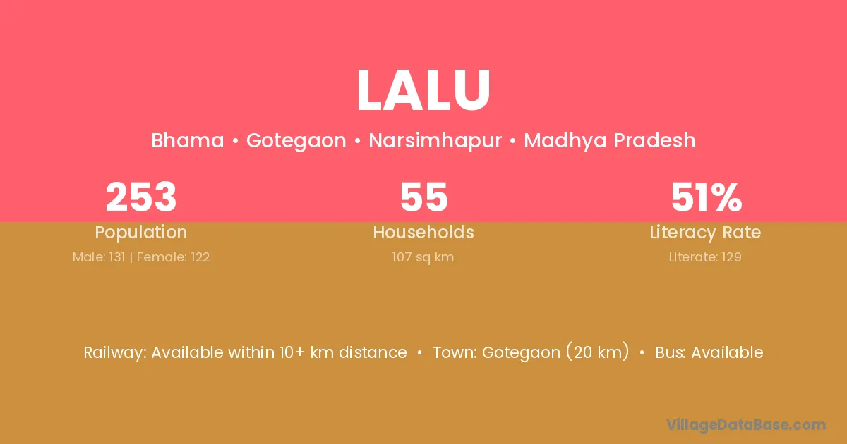 Lalu village has a total population of 253 people, of which 131 are males and 122 are females.