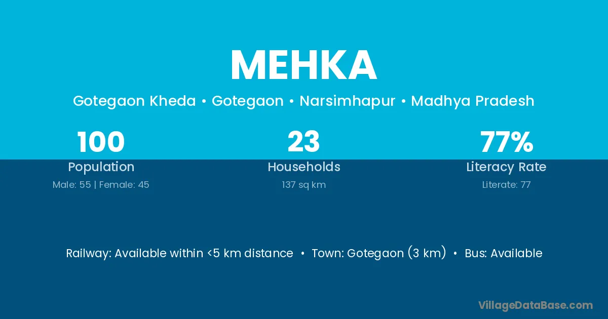 Gotegaon (3 km) is the nearest town to Mehka village for major economic activities and is located approximately 3 km away.