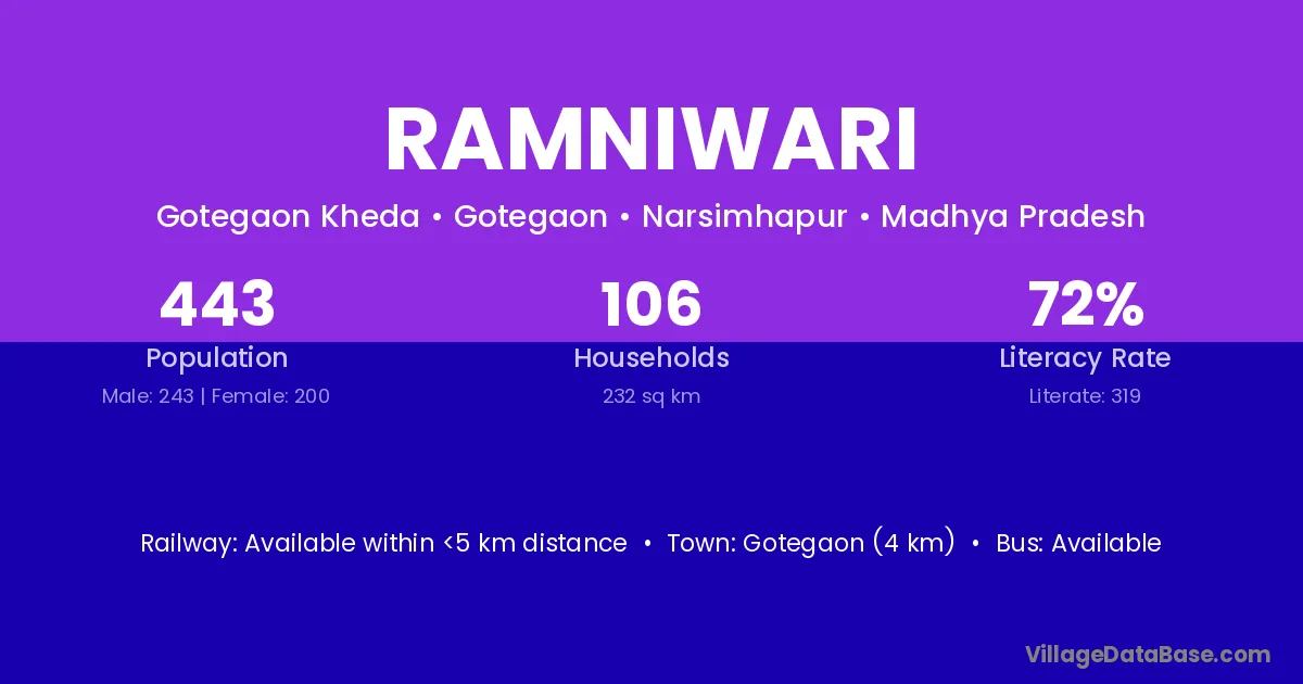Gotegaon (4 km) is the nearest town to Ramniwari village for major economic activities and is located approximately 4 km away.