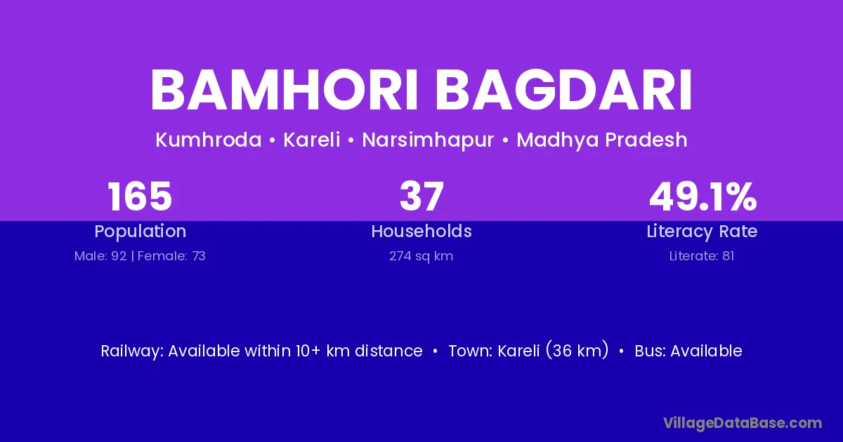 Kareli (36 km) is the nearest town to Bamhori Bagdari village for major economic activities and is located approximately 36 km away.
