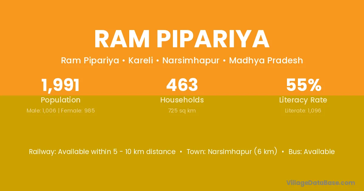 Narsimhapur (6 km) is the nearest town to Ram Pipariya village for major economic activities and is located approximately 6 km away.