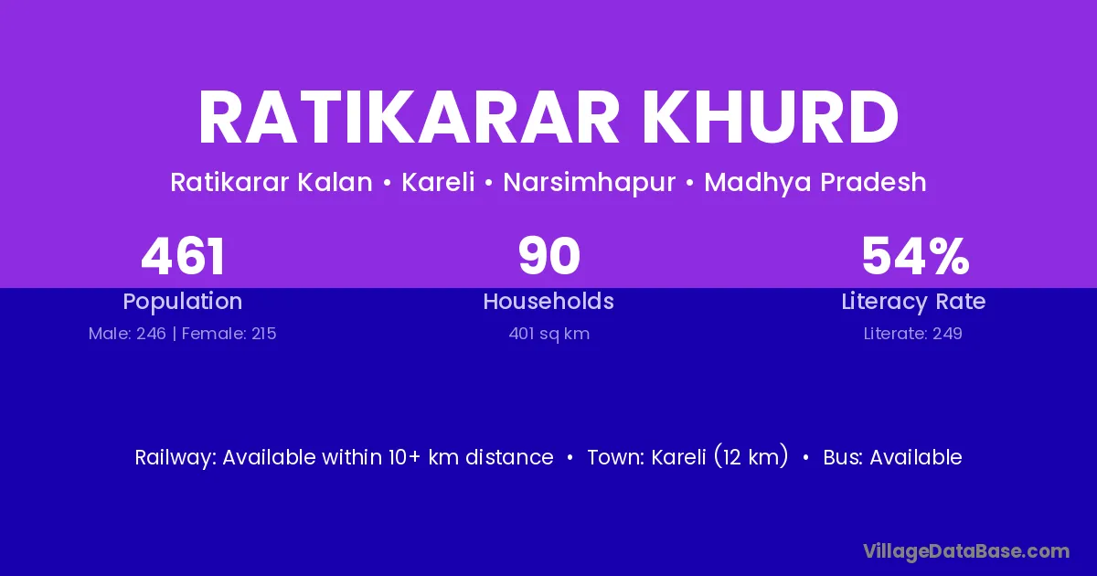 Kareli (12 km) is the nearest town to Ratikarar Khurd village for major economic activities and is located approximately 12 km away.