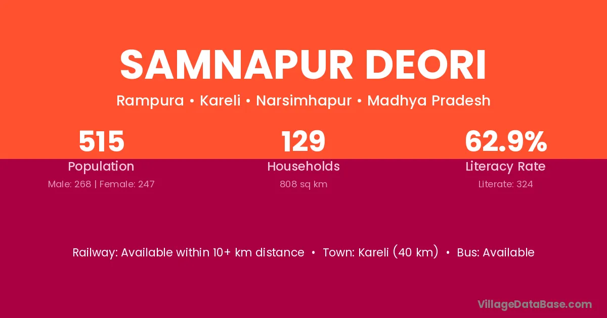 Kareli (40 km) is the nearest town to Samnapur Deori village for major economic activities and is located approximately 40 km away.