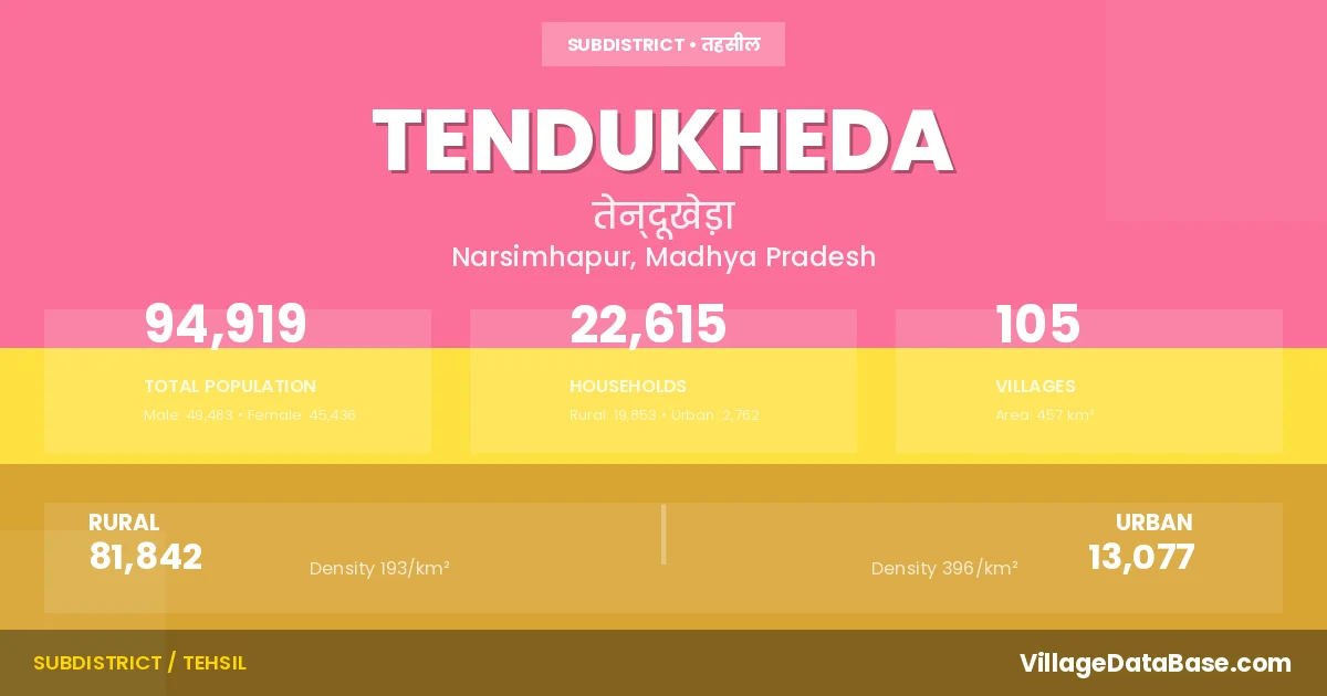 According to the 2011 census The total area of Tendukheda Tehsil is 457 km², with a population of 94919 people. The population density is 208 inhabitants per square kilometre, and there are approximately 22615 houses in the sub district.