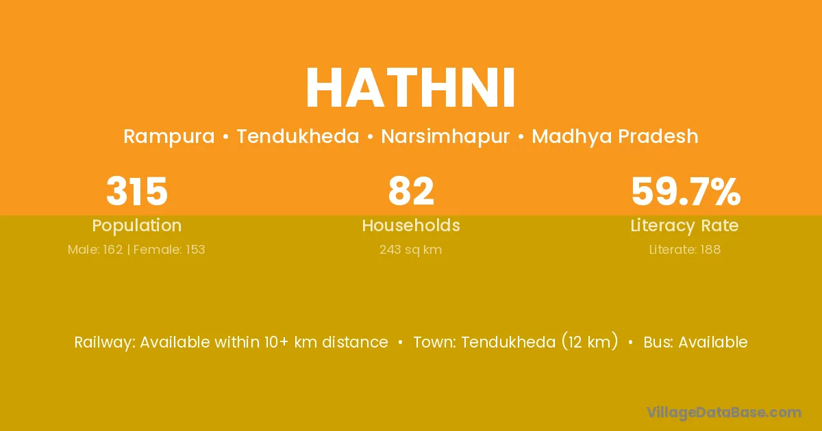 Tendukheda (12 km) is the nearest town to Hathni village for major economic activities and is located approximately 12 km away.