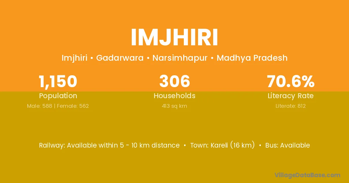 Kareli (24 km) is the nearest town to Imjhiri village for major economic activities and is located approximately 24 km away.