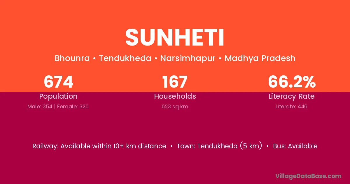 Tendukheda (5 km) is the nearest town to Sunheti village for major economic activities and is located approximately 5 km away.