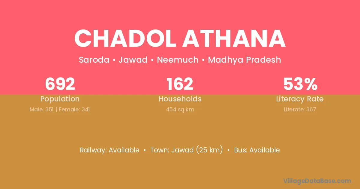 Jawad (25 km) is the nearest town to Chadol Athana village for major economic activities and is located approximately 25 km away.