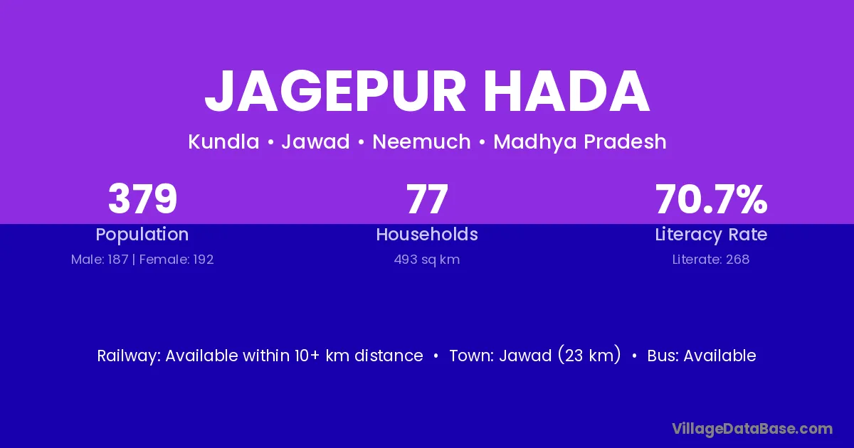 Jawad (23 km) is the nearest town to Jagepur Hada village for major economic activities and is located approximately 23 km away.