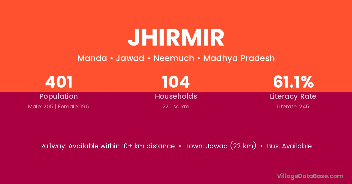 Jawad (22 km) is the nearest town to Jhirmir village for major economic activities and is located approximately 22 km away.