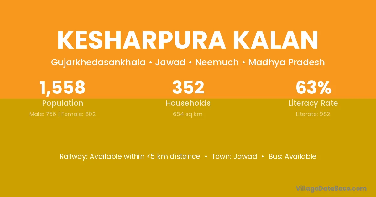 Kesharpura Kalan village has a total population of 1,558 people, of which 756 are males and 802 are females.