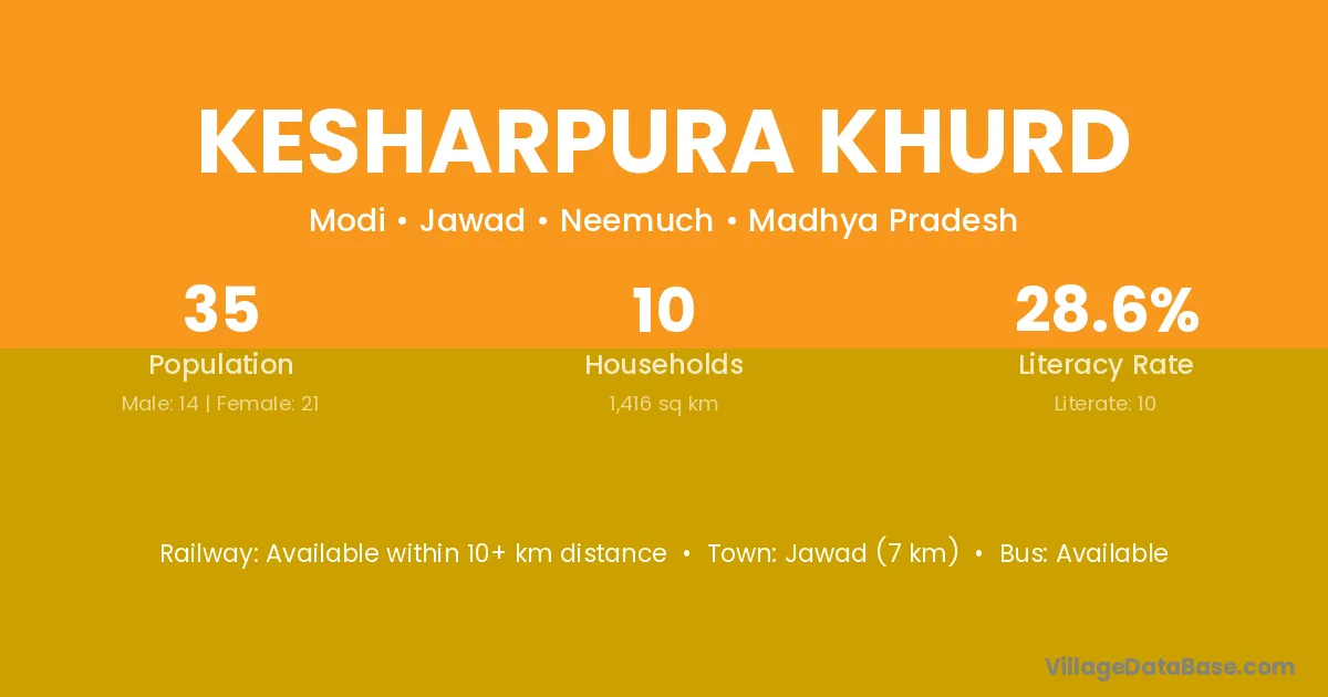 Jawad (7 km) is the nearest town to Kesharpura Khurd village for major economic activities and is located approximately 7 km away.