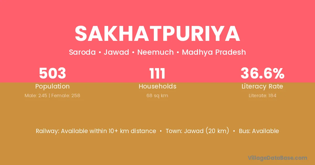 Jawad (20 km) is the nearest town to Sakhatpuriya village for major economic activities and is located approximately 20 km away.
