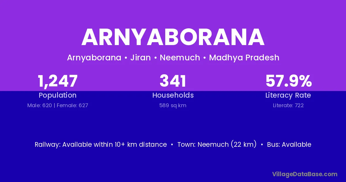 Neemuch (22 km) is the nearest town to Arnyaborana village for major economic activities and is located approximately 22 km away.