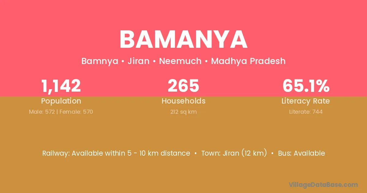 Jiran (12 km) is the nearest town to Bamanya village for major economic activities and is located approximately 12 km away.