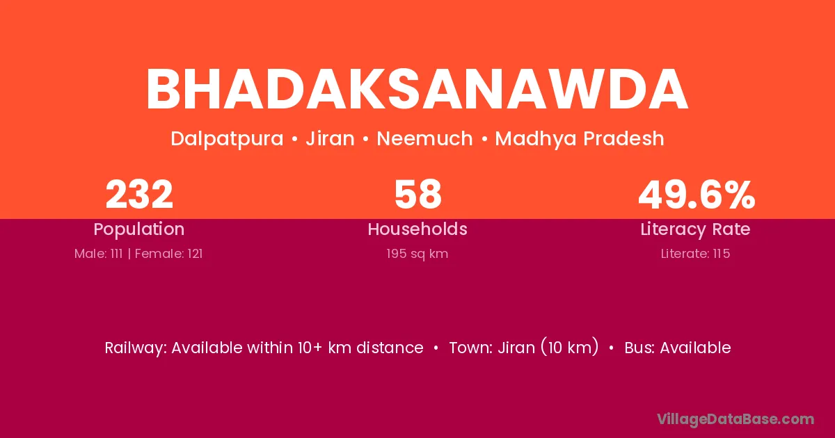 Bhadaksanawda village has a total population of 232 people, of which 111 are males and 121 are females.