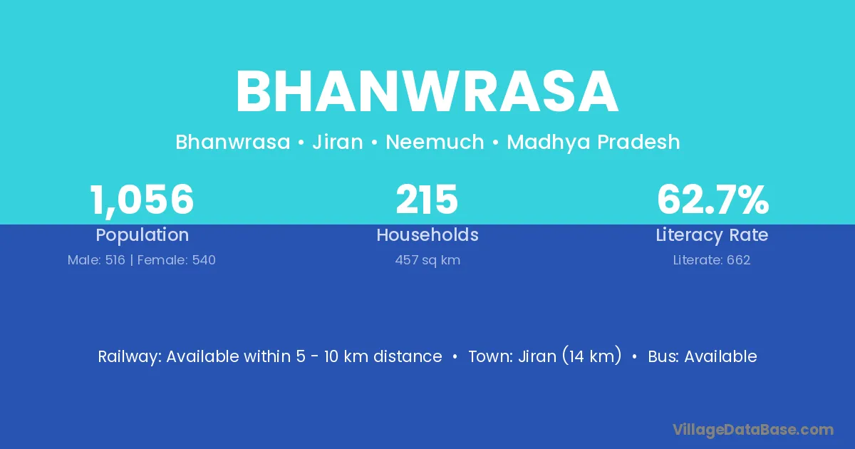 Jiran (14 km) is the nearest town to Bhanwrasa village for major economic activities and is located approximately 14 km away.