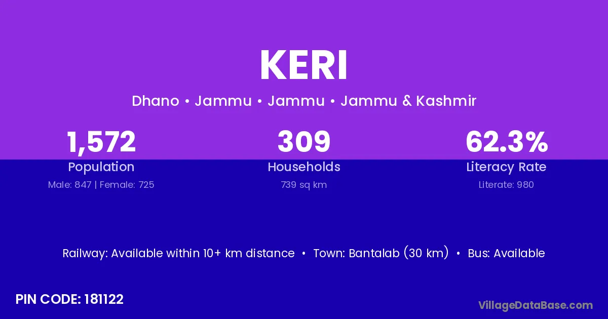 The literacy rate of Keri village is 62.64%. Male literacy stands at 79.23% and female literacy at 46.67%.