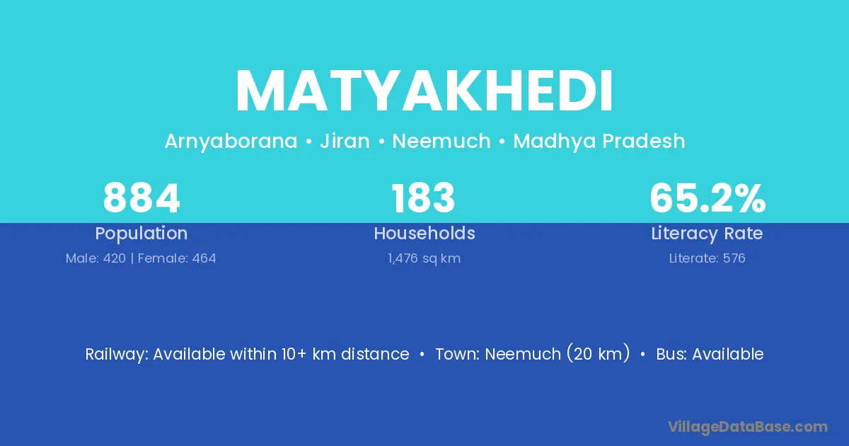 Matyakhedi village has a total population of 884 people, of which 420 are males and 464 are females.