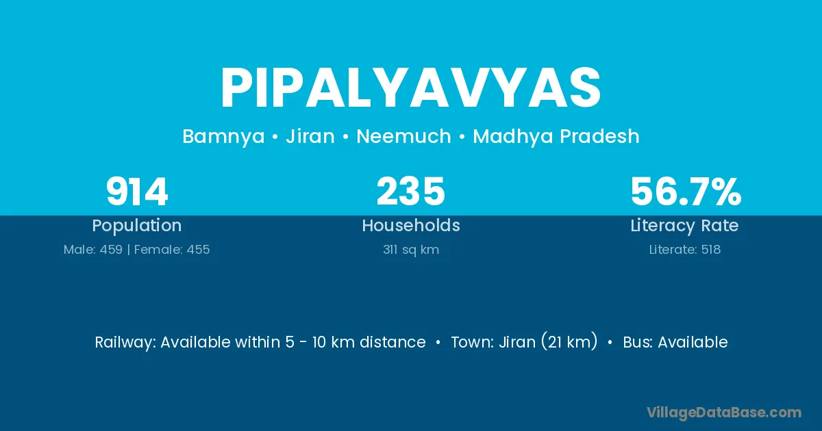 Jiran (21 km) is the nearest town to Pipalyavyas village for major economic activities and is located approximately 21 km away.