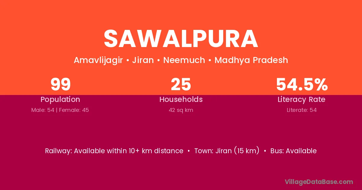 Sawalpura village has a total population of 99 people, of which 54 are males and 45 are females.