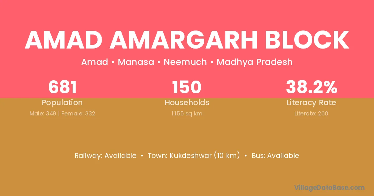 Kukdeshwar (10 km) is the nearest town to Amad Amargarh Block village for major economic activities and is located approximately 10 km away.