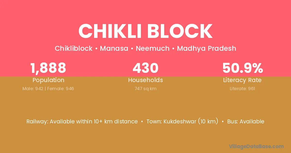 Kukdeshwar (10 km) is the nearest town to Chikli Block village for major economic activities and is located approximately 10 km away.