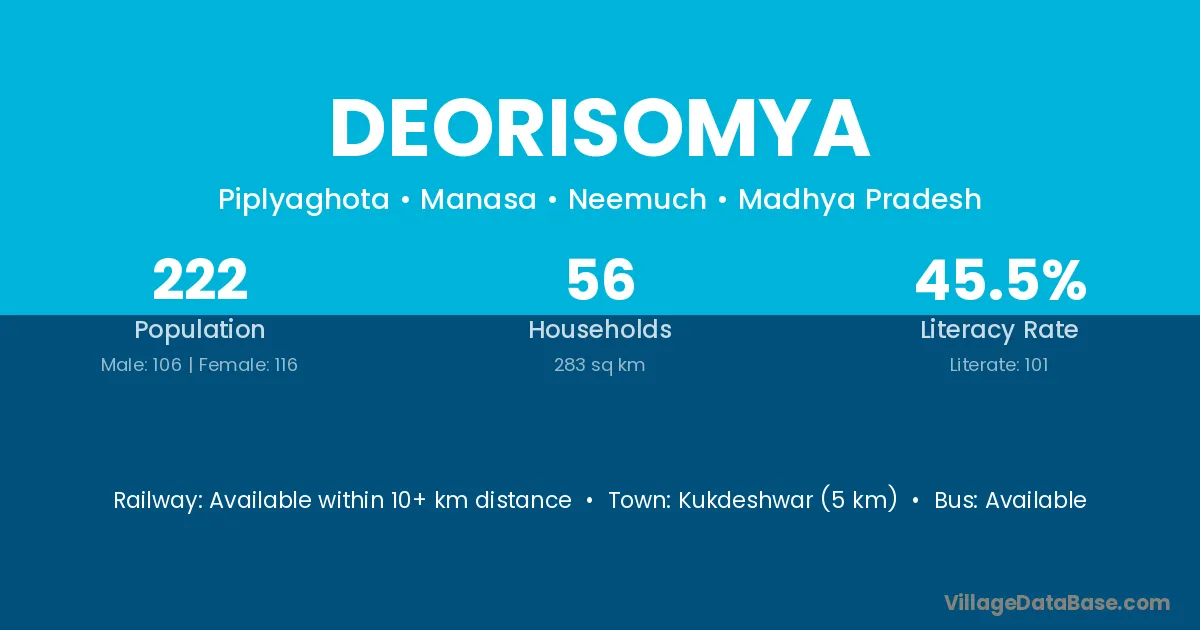 Kukdeshwar (5 km) is the nearest town to Deorisomya village for major economic activities and is located approximately 5 km away.