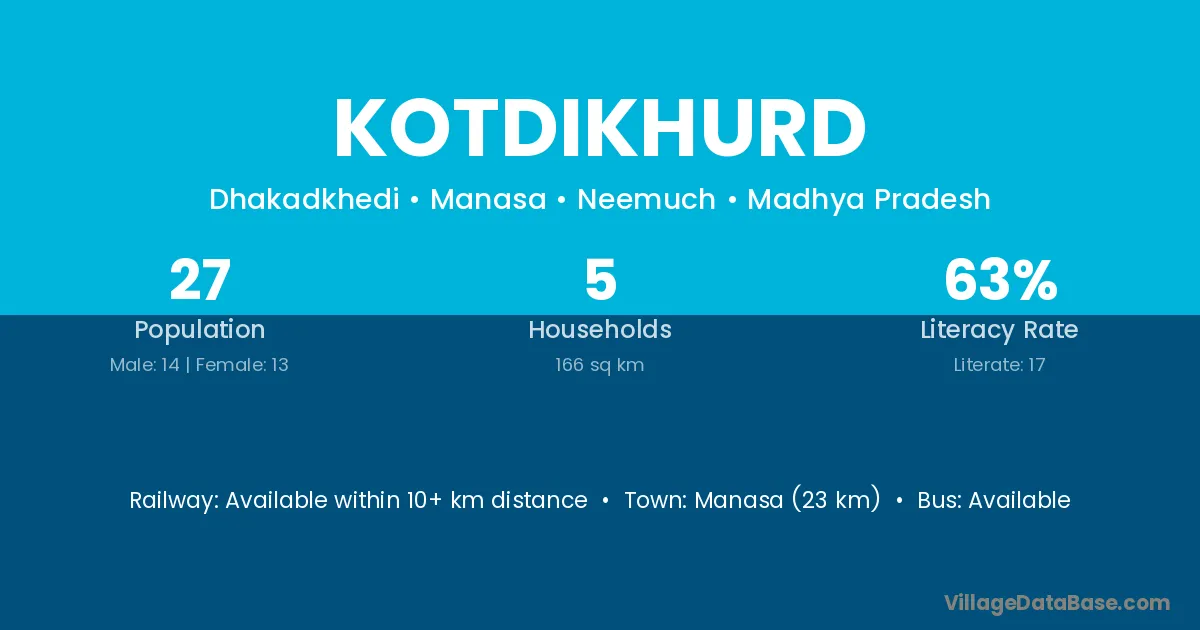 Manasa (23 km) is the nearest town to Kotdikhurd village for major economic activities and is located approximately 23 km away.
