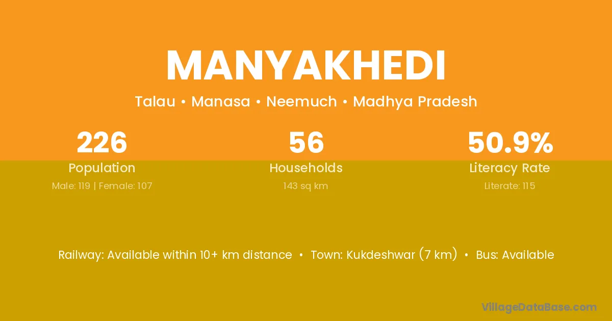 Manyakhedi village has a total population of 226 people, of which 119 are males and 107 are females.