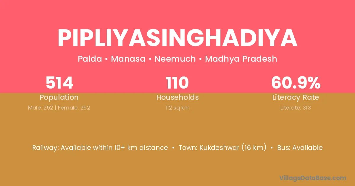 Kukdeshwar (16 km) is the nearest town to Pipliyasinghadiya village for major economic activities and is located approximately 16 km away.